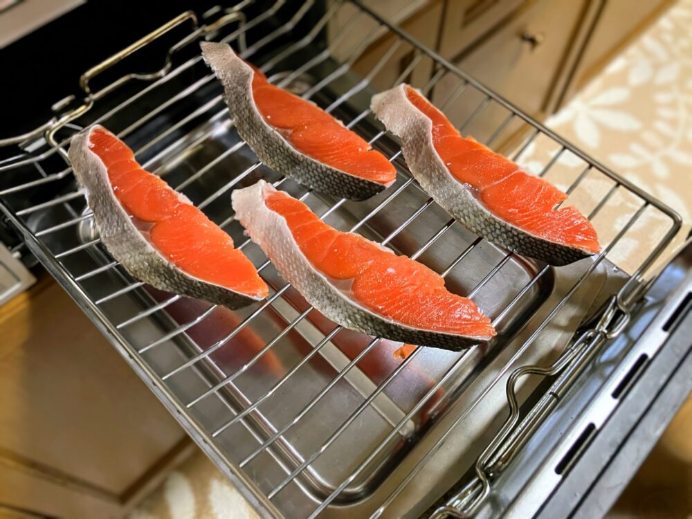 焼く15〜20分前に切り身に塩を振り、出てきた水分をキッチンペーパーでしっかり拭き取りましょう。切り身を焼く前に少し常温で置いておくと、身の中心まで均一に火が通りやすくなります。