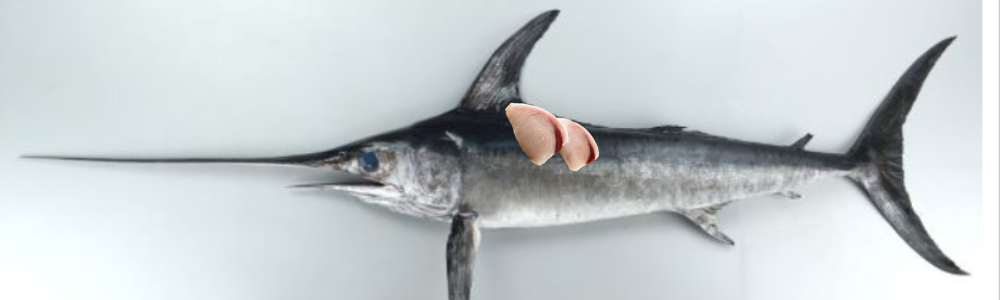 切り身が大きい理由は、魚の本体が本当に大きいからなんですね。上の画像では、カジキ全体の体に切り身を“仮置き”しています。ちょうど切り身が乗っている位置が、実際にスーパーで販売されている 切り身1枚(=上身の一部)に相当する場所 です。
